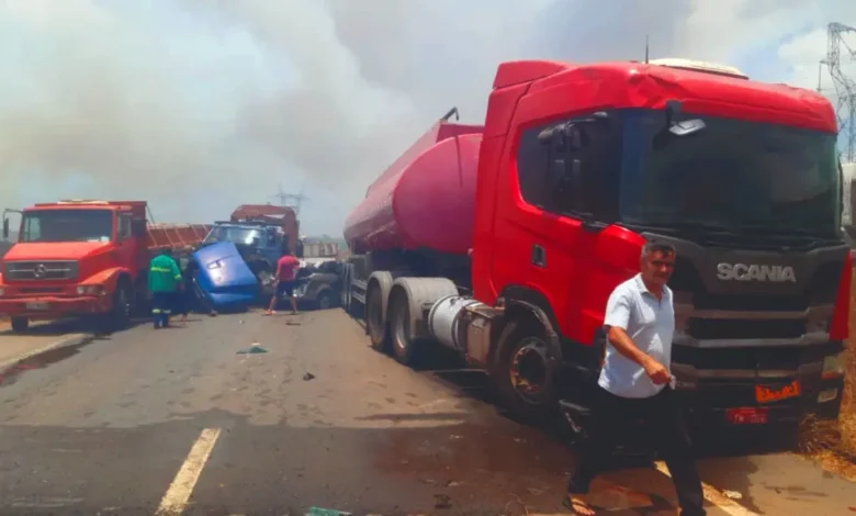 Imagens feitas por motoristas mostram diversos veículos colididos, incluindo uma viatura da Polícia Rodoviária Federal (PRF) e uma carreta carregada com botijões de gás de cozinha. Há relatos de vítimas presas entre as ferragens, e a fumaça intensa no local compromete a visibilidade, aumentando o risco de novos acidentes.