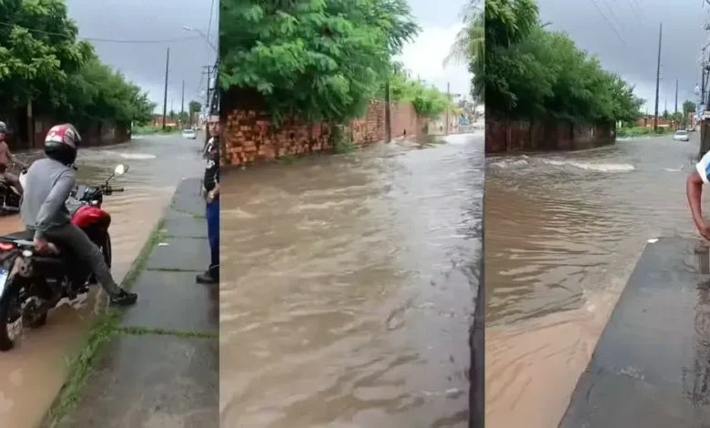 No bairro São Bernardo, uma avenida ficou completamente alagada. As imagens mostram toda a via coberta pela água, um carro boiando e motoristas parados, com medo de atravessar o trecho por causa do risco de ficar ilhado ou ter o veículo arrastado.