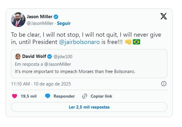 O empresário Jason Miller, conselheiro do presidente dos Estados Unidos, Donald Trump, publicou hoje uma mensagem nas redes sociais em que afirma que “não vai parar” até que o ex-presidente Jair Bolsonaro (PL) “esteja livre”.