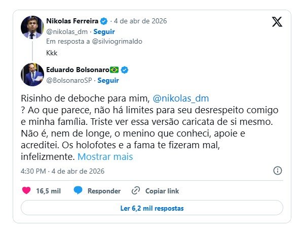 “Risinho de deboche para mim, @nikolas_dm? Ao que parece, não há limites para seu desrespeito comigo e minha família. Triste ver essa versão caricata de si mesmo. Não é, nem de longe, o menino que conheci, apoiei e acreditei”, diz a resposta de Eduardo.