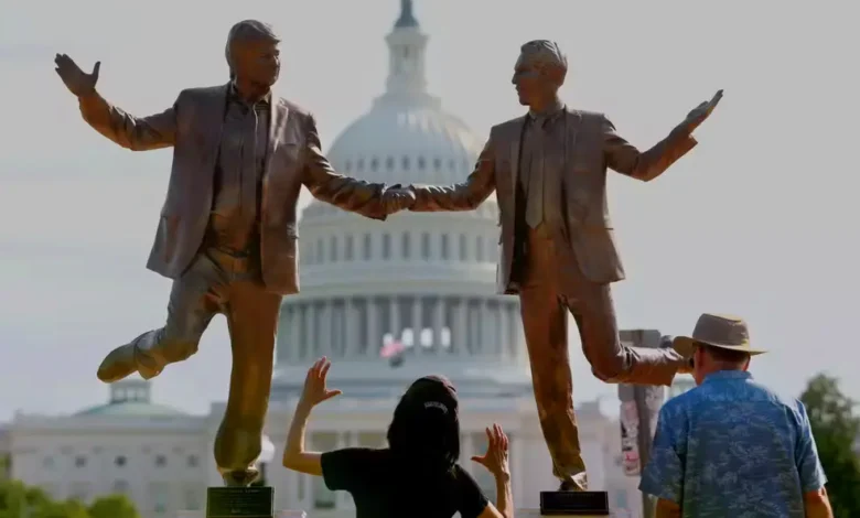 Estátua de Trump e Epstein de mãos dadas aparece em frente à sede do Congresso dos EUA