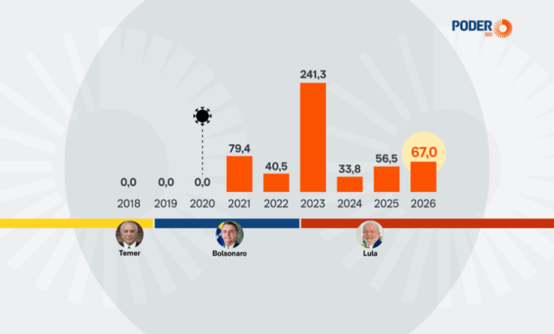 No 1º ano da pandemia, em 2020, o Congresso aprovou um decreto de calamidade pública e suspendeu a meta fiscal por causa da crise sanitária. Houve uma licença para o governo de Jair Bolsonaro (hoje no PL) gastar R$ 520 bilhões sem descumprir a regra, via crédito extraordinário. Por isso os valores para esse período estão zerados no quadro acima. No próximo ano, 2026, são esperados gastos fora da meta de gastos primários com estes itens: precatórios: R$ 57,8 bilhões; investimentos de estatais: R$ 4,2 bilhões; investimentos em defesa: R$ 5 bilhões. Esse valor está em projeto de lei na Câmara, já aprovado pelo Senado, que estabelece estouro de R$ 30 bilhões no teto em 5 anos. GASTO AUMENTA EM 2025 Houve licença especial do Congresso para acomodar gastos em 2023, na chamada PEC fura-teto. Depois, no ano seguinte, foi aprovado o novo marco fiscal. O estouro do teto ficou em R$ 31,8 bilhões. Chegará a R$ 47 bilhões em 2025. E subirá mais (R$ 67 bilhões) em 2026. O governo Lula retirará R$ 208,4 bilhões das regras fiscais se desconsiderados os precatórios (sentenças judiciais) de 2023 a 2026. A PEC fura-teto representa 69,6% deste valor.