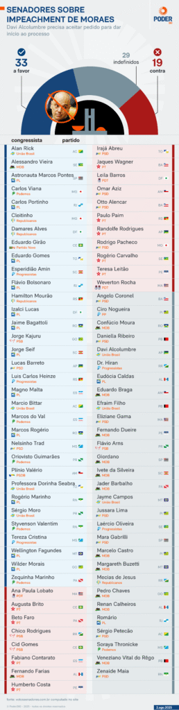 Os dados, do site “votossenadores.com.br”, mostram que 34 senadores são a favor do impeachment e 19 são contra. Há ainda outros 28 indefinidos. Vanderlan Cardoso (PSD-GO) aparece como um dos votos favoráveis. Porém, pediu licença do cargo em 1º de julho e Pedro Chaves (MDB-GO) assumiu a vaga. Para a contagem realizada pelo Poder360, o suplente foi incluído entre os indefinidos.