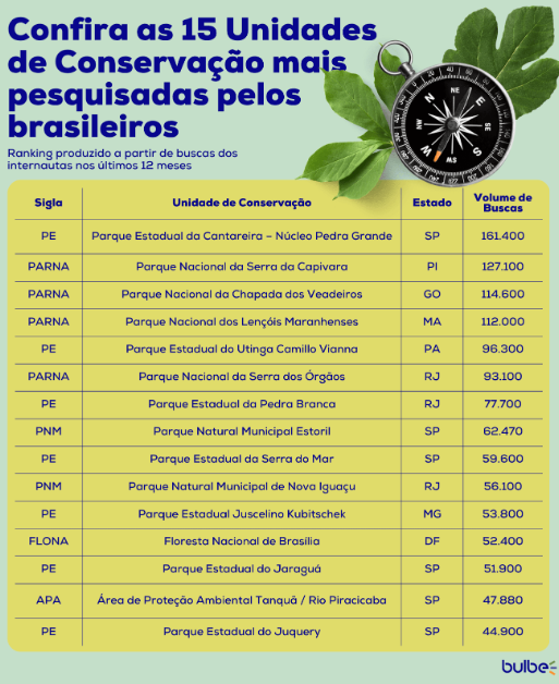 O levantamento considerou todas essas categorias e analisou os volumes de busca associados a nomes específicos de unidades que aparecem nas pesquisas dos brasileiros. A partir desse cruzamento, foi produzido um ranking com as 15 Unidades de Conservação mais buscadas no último ano, revelando os destinos naturais que mais despertaram o interesse do público.