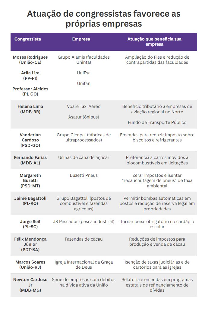 A situação abre espaço para que a atuação legislativa possa se confundir com o interesse dos grupos empresariais.
