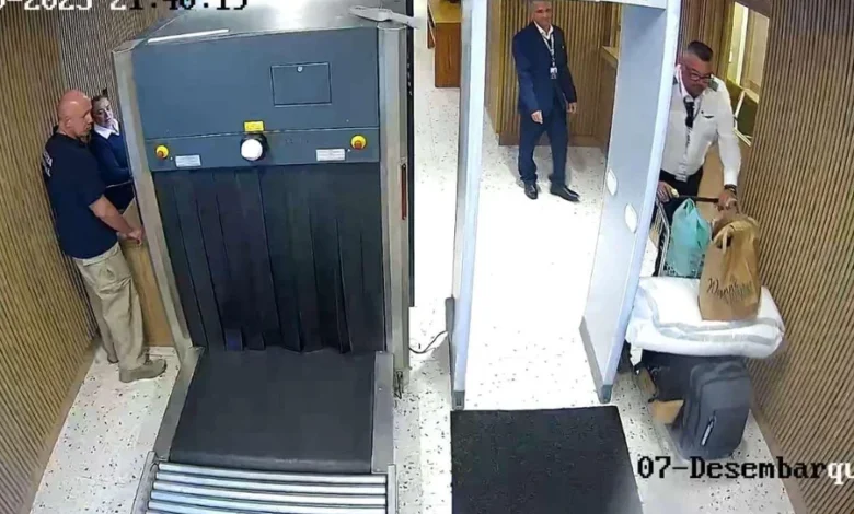 “[Ele] retorna passando por fora do pórtico de detecção de metais, sendo que, por volta das 21h40, ele passa com 7 (sete) volumes, sem submetê-los à fiscalização pelo raio-X, sendo que 2 (dois) dos volumes aparentam os que ele carregava ao retornar pelo raio-X pela primeira vez”, diz o relatório.