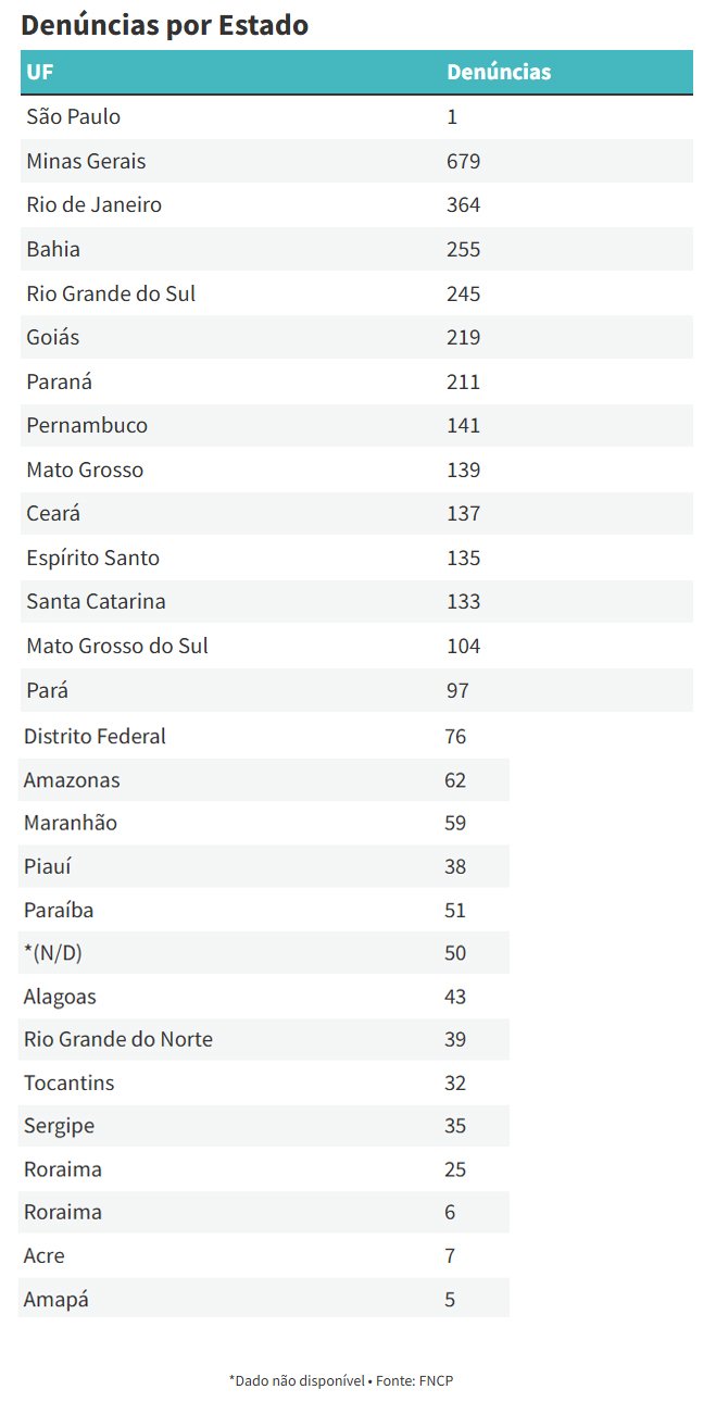 Número de denúncias de trabalho escravo cresceu nos últimos cinco anos. Em 2025, o Disque 100 recebeu 4.516 denúncias contra 3.959 em 2024 — uma alta de 14%. As reclamações vêm aumentando ano após ano: 2023 (3.430 denúncias), 2022 (2.084), 2021 (1.918) e 2020 (915). Os dados são do Ministério dos Direitos Humanos e Cidadania, em resposta a um pedido de LAI (Lei de Acesso à Informação).