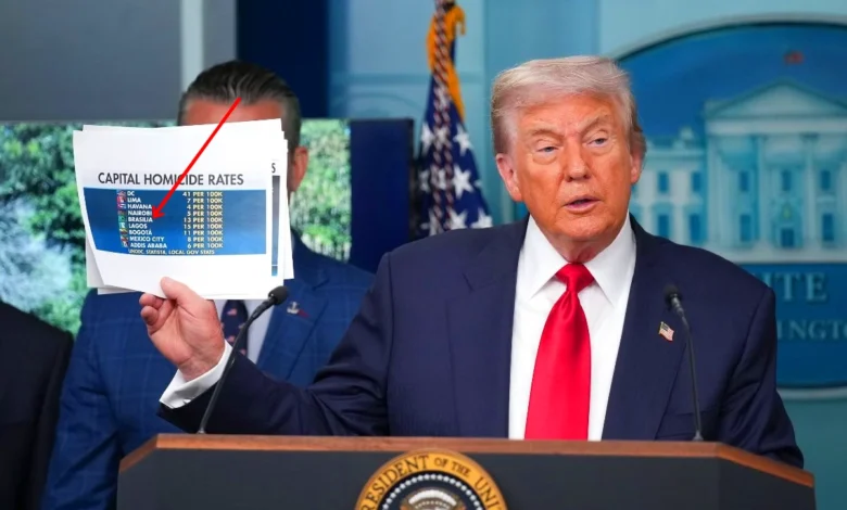 Os dados incoerentes foram divulgados por Trump durante anúncio de estado de emergência de segurança pública em Washington D.C. O presidente comparou a taxa de criminalidade da capital dos EUA com a de outras capitais do mundo, incluindo Brasília.