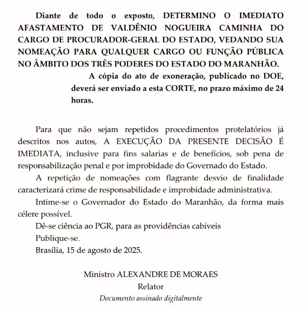 Em uma decisão que promete estremecer o cenário político maranhense, o ministro Alexandre de Moraes, do Supremo Tribunal Federal (STF), determinou o afastamento imediato do Procurador-Geral do Estado, Valdênio Nogueira Caminha. Ele é acusado de descumprir ordens judiciais e de favorecer aliados em um suposto esquema de nepotismo cruzado. A medida foi tomada após denúncia do partido Solidariedade, que apontou irregularidades em nomeações envolvendo o governador Carlos Brandão (PSB), a Assembleia Legislativa, a Companhia Maranhense de Gás (GASMAR) e o SEBRAE-MA.