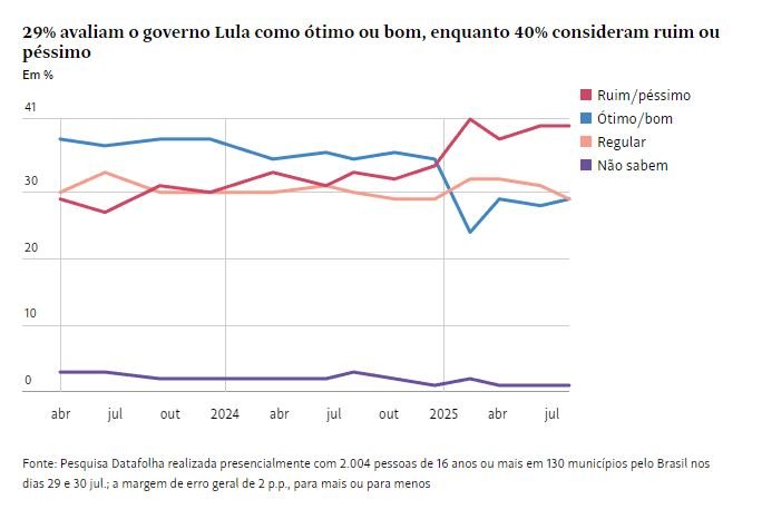 SÃO PAULO A expectativa do entorno do presidente Lula (PT) acerca de ganhos de imagem imediatos no embate com o americano Donald Trump não se concretizou. Segundo o Datafolha, o petista segue com avaliação estável, tendo seu governo reprovado por 40% e aprovado por 29%.